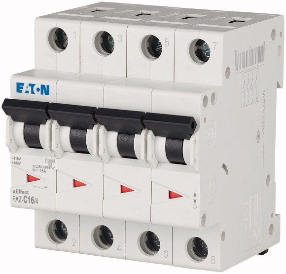 This is xEffect 16A MCB Mini Circuit Breaker4P Curve C Breaking Capacity 10 kA 240 → 415V manufactured by Eaton. The manufacturer part number is 279061 FAZ-C16/4. The product has 10 ka breaking capacity at maximum voltage rating. The product has a current rating of 16a. This is a type of mcb, a circuit breaker with unique features. It utilises thermal-magnetic tripping mechanism. Its accurate length is 70.8mm. It has a model number faz-c16/4. The product has a rated DC voltage of 96v. The product is available in din rail mount style. Furthermore, the product is 66mm wide. The product comes in 80mm depth. The product has a rated AC voltage of 240 → 415v. It has a/an instantaneous break time . It features xeffect range. The terminal contact is kind of screw. It allows type c tripping features. It has equipped with 4 poles. It is a toggle switch reset actuator.
