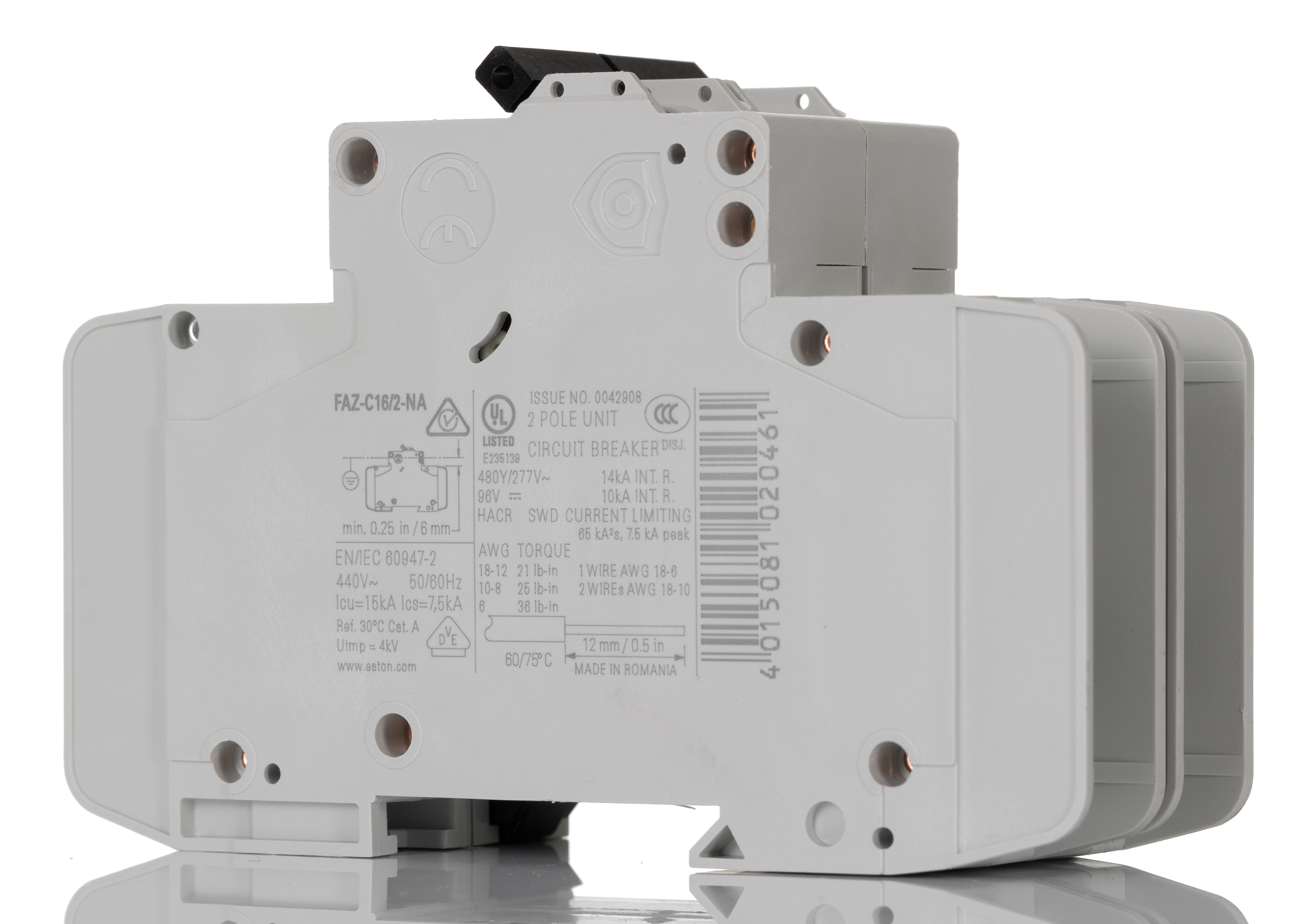 This is xEffect 16A MCB Mini Circuit Breaker2P Curve C Breaking Capacity 10 kA 240 → 415V manufactured by Eaton. The manufacturer part number is 102170 FAZ-C16/2-NA. The product has a current rating of 16a. Applications Information involves commercial, residential. This is a type of mcb, a circuit breaker with unique features. Its accurate length is 35.4mm. It has a model number faz-c16/2-na. It allows type c tripping features. The product is available in din rail mount style. Furthermore, the product is 105mm wide. The product comes in 76mm depth. The product has a rated AC voltage of 240 → 415v. The product has 10 ka breaking capacity at maximum voltage rating. It features xeffect range. The terminal contact is kind of clip-on, screw. It has equipped with 2p poles. It is a toggle switch reset actuator.