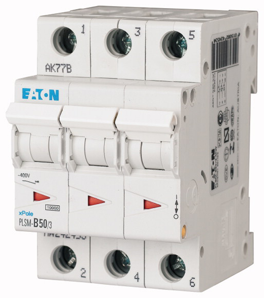 This is xPole 50A MCB Mini Circuit Breaker3P Curve C Breaking Capacity 10 kA manufactured by Eaton. The manufacturer part number is 242479 PLSM-C50/3-MW. The product has a current rating of 50a. This is a type of mcb, a circuit breaker with unique features. Its accurate length is 52.5mm. The product has a rated DC voltage of 48v. The product is available in din rail mount style. Furthermore, the product is 80mm wide. The product comes in 75mm depth. It features xpole range. The product has 10 ka breaking capacity at maximum voltage rating. It allows type c tripping features. It has equipped with 3p poles.