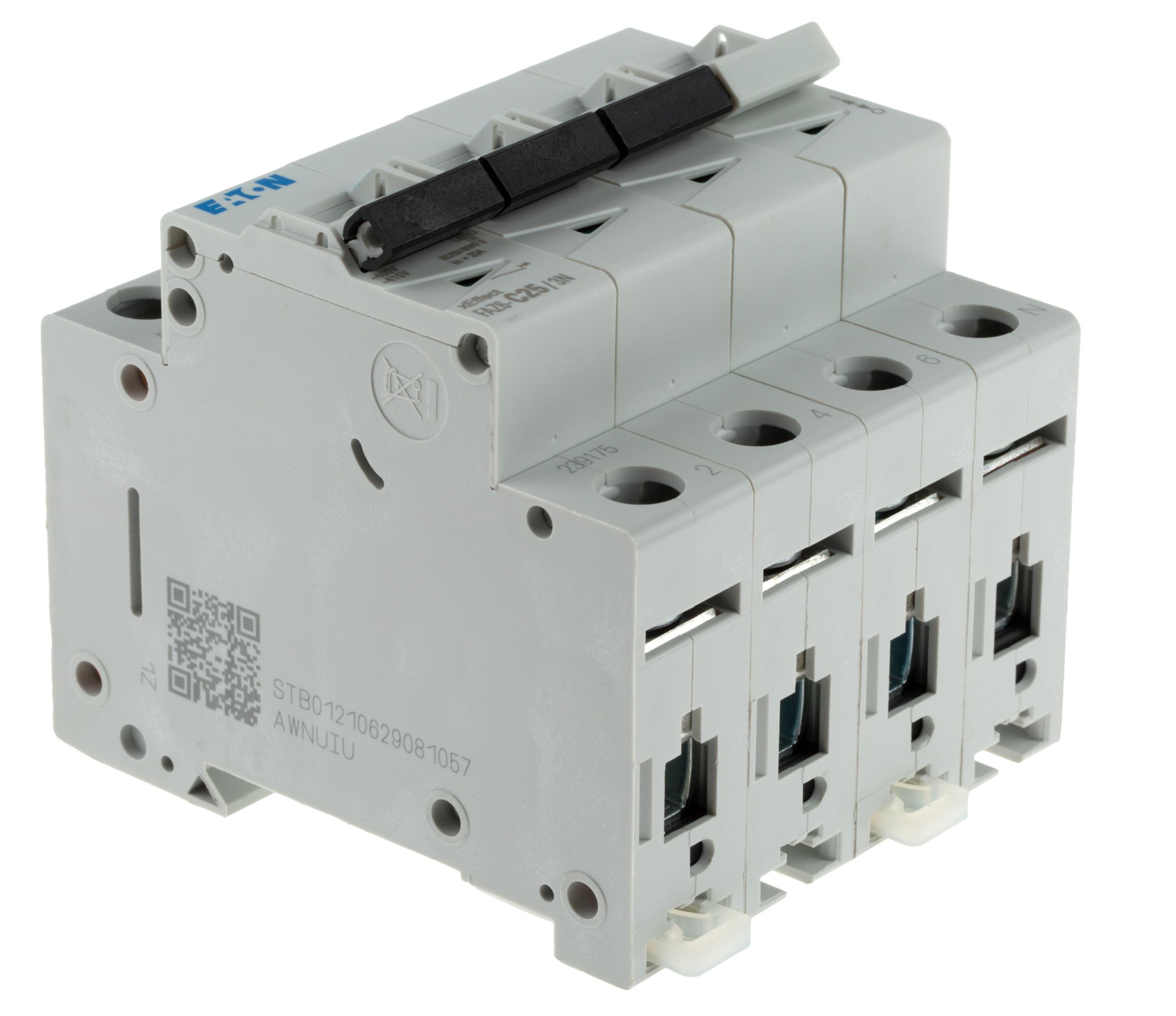 This is xEffect 25A MCB Mini Circuit Breaker Curve C Breaking Capacity 6 kA 230 → 400V manufactured by Eaton. The manufacturer part number is 239175 FAZ6-C25/3N. The product has a current rating of 25a. This is a type of mcb, a circuit breaker with unique features. Its accurate length is 80mm. It allows type c tripping features. The product is available in din rail mount style. Furthermore, the product is 17.5mm wide. The product comes in 62mm depth. The product has a rated AC voltage of 230 → 400v. It features xeffect range. The product has 6 ka breaking capacity at maximum voltage rating. It has equipped with 3p poles.