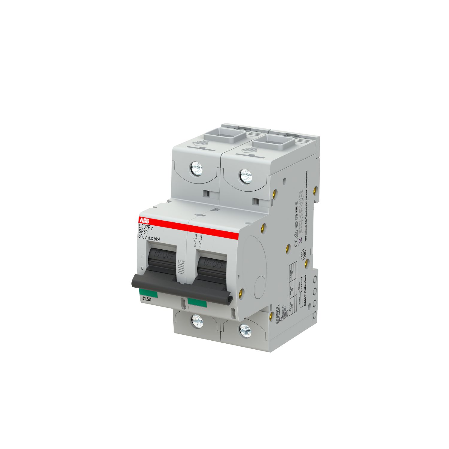 This is S800PV 63A MCB2P Curve B manufactured by ABB. The manufacturer part number is 2CCF019605R0001 S802PV-SP63 - 5 kA. The product has a current rating of 63a. This is a type of mcb, a circuit breaker with unique features. It utilises thermal tripping mechanism. The product s800pv, is a highly preferred choice for users. Its accurate length is 82.5mm. It has a model number s802pv-sp63. The product has a rated DC voltage of 800v. The product is available in din rail mount style. Furthermore, the product is 54mm wide. The product comes in 82.5mm depth. The product has 5 ka breaking capacity at maximum voltage rating. The terminal contact is kind of cage clamp. It allows type b tripping features. It has equipped with 2 poles. It is a toggle switch reset actuator.