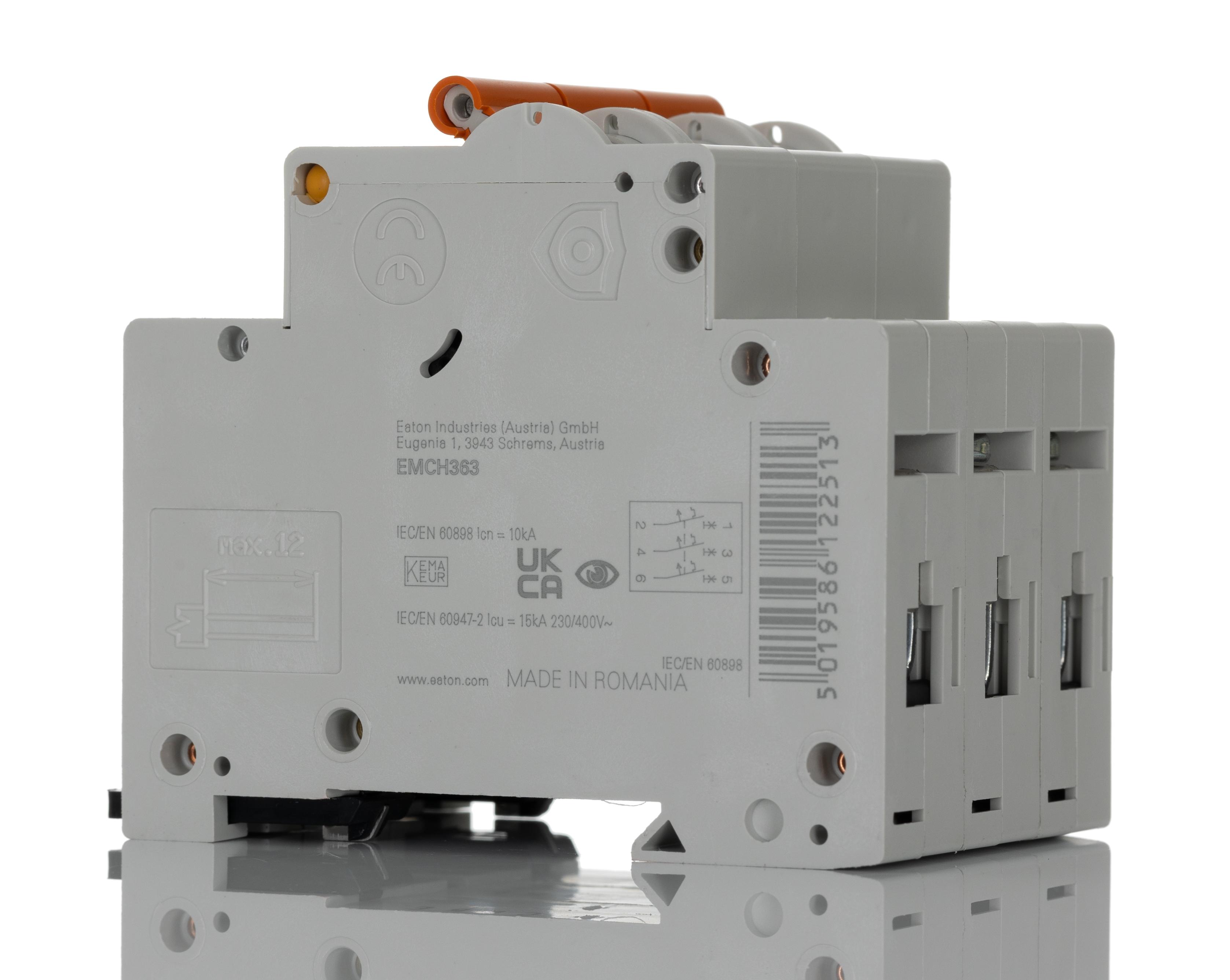 This is MEMShield MCB 3P 63A Curve C 230V AC 48V DC 10 kA Breaking Capacity manufactured by Eaton. The manufacturer part number is EMCH363 Y7-EMCH363. The product has a current rating of 63a. This is a type of mcb, a circuit breaker with unique features. Its accurate length is 54mm. The product has 10 ka breaking capacity at maximum voltage rating. The product has a rated DC voltage of 48v. The product is available in din rail mount style. Furthermore, the product is 75mm wide. The product comes in 80mm depth. The product has a rated AC voltage of 230 v, 240v. It has a/an instantaneous break time . It features memshield range. The terminal contact is kind of screw. It allows type c tripping features. It has equipped with 3p poles. It is a toggle switch reset actuator.