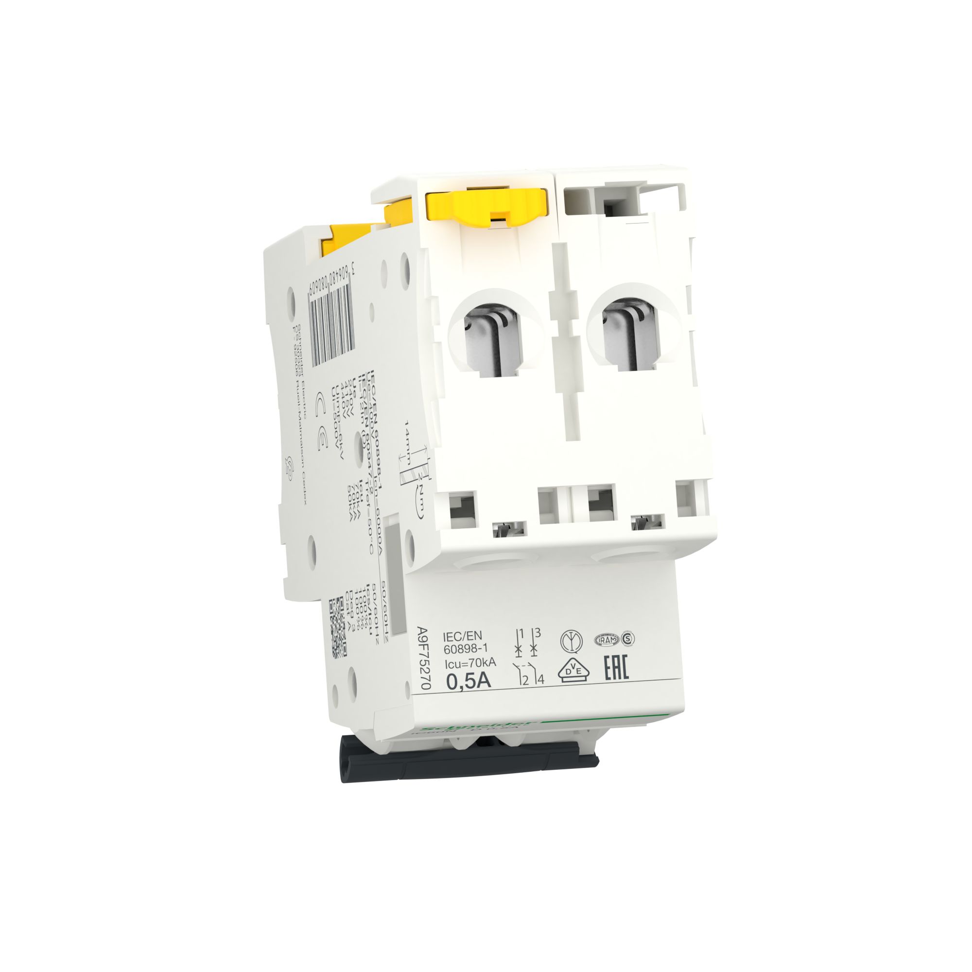 This is Acti9 Acti9 iC60 MCB 2P 500mA Curve D 400V AC 125V DC 6000 A Breaking Capacity manufactured by Schneider Electric. The manufacturer part number is A9F75270. The product has a current rating of 500ma. The product acti9 ic60, is a highly preferred choice for users. The product has a rated DC voltage of 125v. It features acti9 range. The product has a rated AC voltage of 400v. The product has 6000 a breaking capacity at maximum voltage rating. It allows type d tripping features. It has equipped with 2 poles.