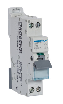 This is MJT MCB 2P 25A Curve C 240 → 400V AC 6 kA Breaking Capacity manufactured by Hager. The manufacturer part number is MJT725. The product has a current rating of 25a. This is a type of mcb, a circuit breaker with unique features. The product mjt, is a highly preferred choice for users. Its accurate length is 96.1mm. The product has 6 ka breaking capacity at maximum voltage rating. It allows type c tripping features. The product is available in din rail mount style. Furthermore, the product is 17.5mm wide. The product comes in 85mm depth. The product has a rated AC voltage of 240 → 400v. The terminal contact is kind of screw. It has equipped with 2 poles. It is a toggle switch reset actuator.