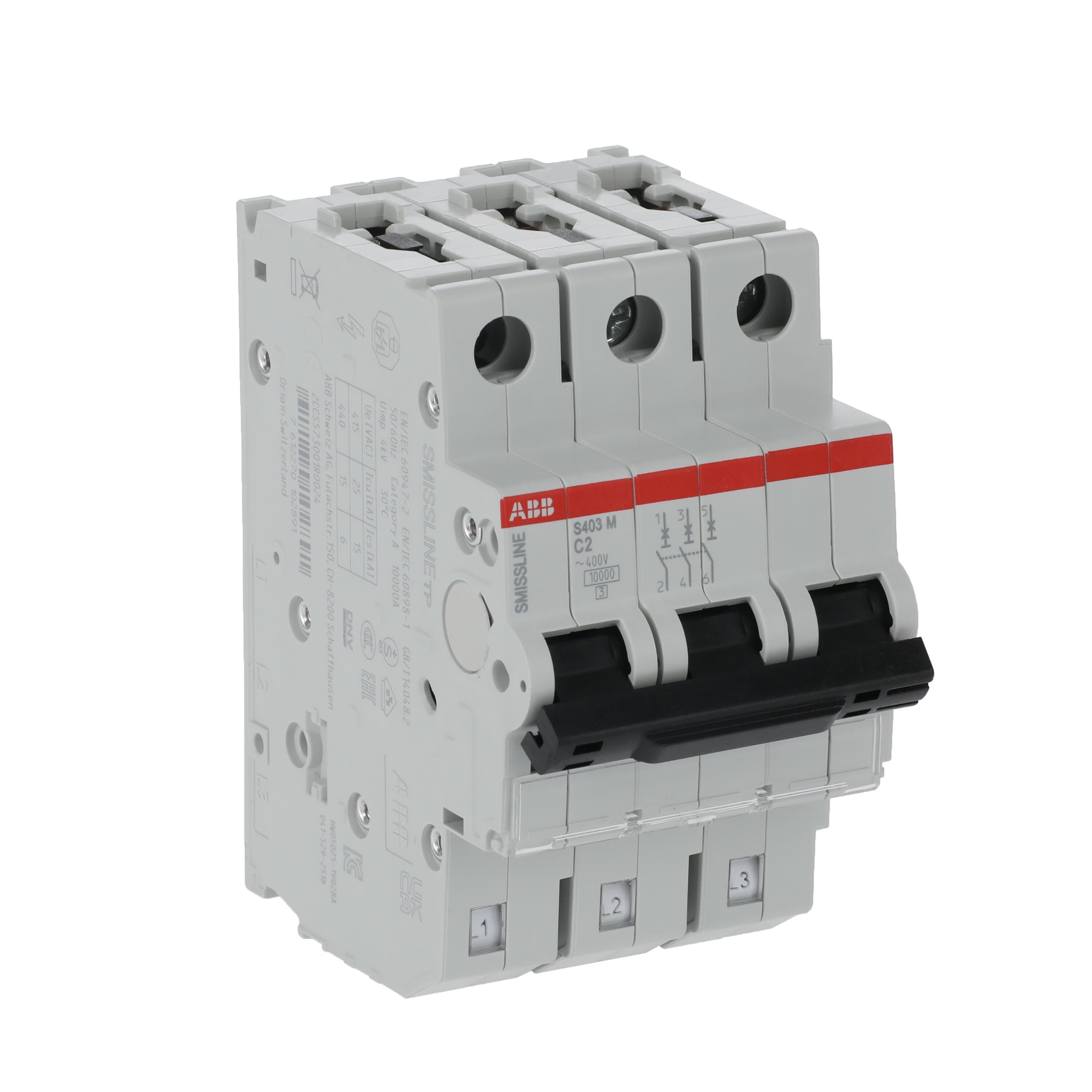 This is SMISSLINE TP S400M MCB 3P 2A Curve C 230V AC 10 kA Breaking Capacity manufactured by ABB. The manufacturer part number is 2CCS573001R0024 S403M-C2. The product has a current rating of 2a. Applications Information involves commercial, industrial. The product s400m, is a highly preferred choice for users. This is a type of mcb, a circuit breaker with unique features. Its accurate length is 91mm. It has a model number s403m-c2. It allows type c tripping features. The product is available in din rail mount style. Furthermore, the product is 54mm wide. The product comes in 75mm depth. The product has a rated AC voltage of 230 v, 400v. The product has 10 ka breaking capacity at maximum voltage rating. It features smissline tp range. The terminal contact is kind of screw. The product also provides special features, such as overload protection, thermal tripping. It has equipped with 3 poles. It is a toggle switch reset actuator.