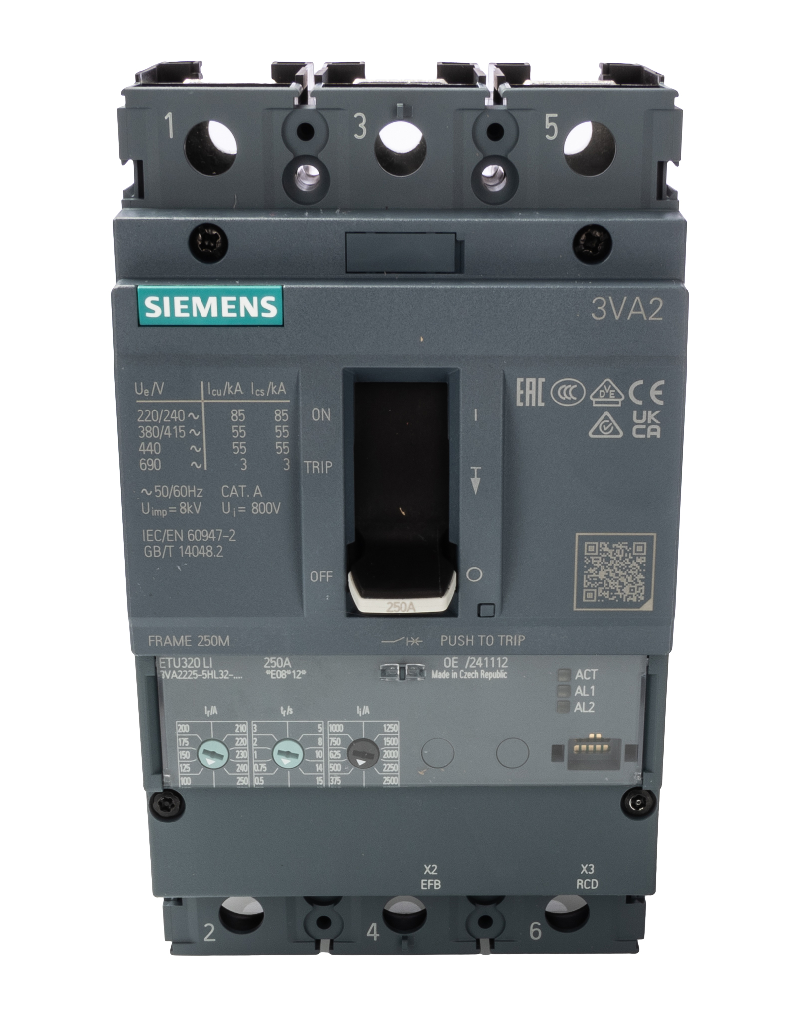 This is 3 250 A MCCB Molded Case Circuit Breaker Breaking Capacity 55 KA Fixed Mount Sentron 3VA manufactured by Siemens. The manufacturer part number is 3VA2225-5HL32-0AA0. Is it a better world product? yes. The product has a current rating of 250a. This is a type of mccb, a circuit breaker with unique features. The given diameter of mounting hole is 4.5mm. The product 3va, is a highly preferred choice for users. Its accurate length is 105mm. The product has 55 ka breaking capacity at maximum voltage rating. The product is available in fixed style. Furthermore, the product is 181mm wide. The product comes in 107mm depth. The product has a rated AC voltage of 690v. It has a/an instantaneous break time . It features sentron range. It has equipped with 3 poles. It is a toggle switch reset actuator.