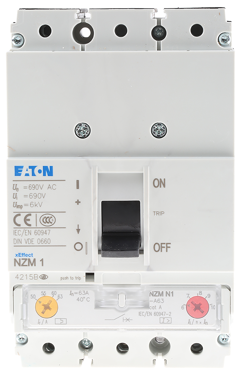 This is xEnergy MCCB 3P 63A Breaking Capacity 50 kA Fixed Mount manufactured by Eaton. The manufacturer part number is 259083 NZMN1-A63. The product has a current rating of 63a. This is a type of mccb, a circuit breaker with unique features. Its accurate length is 90mm. The product has a rated DC voltage of 500v. The product is available in fixed style. Furthermore, the product is 145mm wide. The product comes in 84.5mm depth. The product has a rated AC voltage of 690v. It features xenergy range. The product has 50 ka breaking capacity at maximum voltage rating. It has equipped with 3 poles.