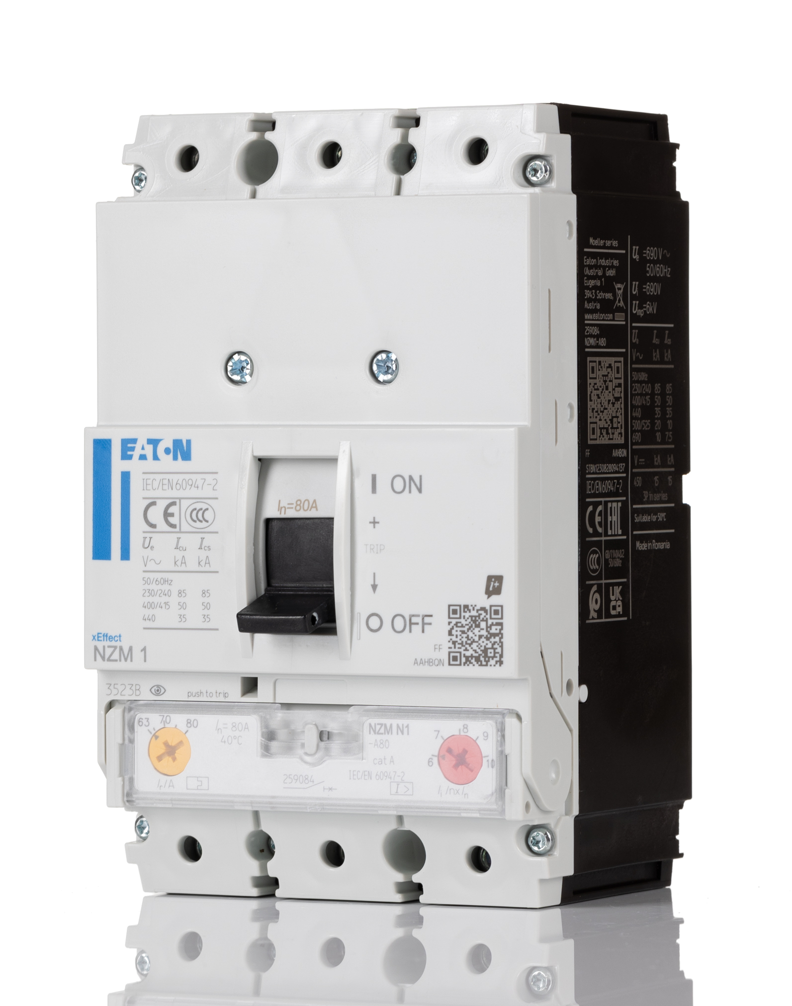 The 259084 NZMN1-A80 from Eaton is a fixed-mount MCCB—a cutting-edge solution designed for reliable protection in electrical systems. This three-pole (3P) moulded-case circuit breaker (MCCB) is rated for 80A and boasts an impressive breaking capacity of 50 kA, ensuring optimal performance even in demanding conditions. Engineered for versatility and durability, the Eaton xEnergy MCCB is ideal for various industrial and commercial applications, providing peace of mind through superior safety features and exceptional reliability.