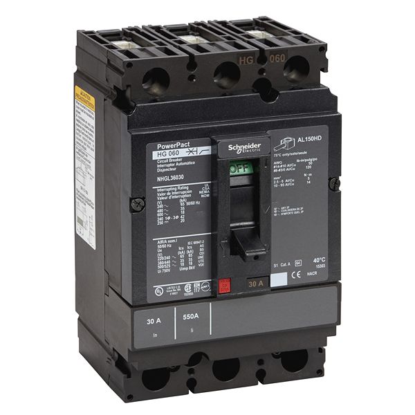 This is PowerPact MCCB 3P 30A Breaking Capacity 18 kA DIN Rail Mount manufactured by Schneider Electric. The manufacturer part number is NHGL36030. The product has a current rating of 30a. The product powerpact, is a highly preferred choice for users. The product is available in din rail mount style. It features powerpact range. The product has 18 ka breaking capacity at maximum voltage rating. It has equipped with 3 poles.