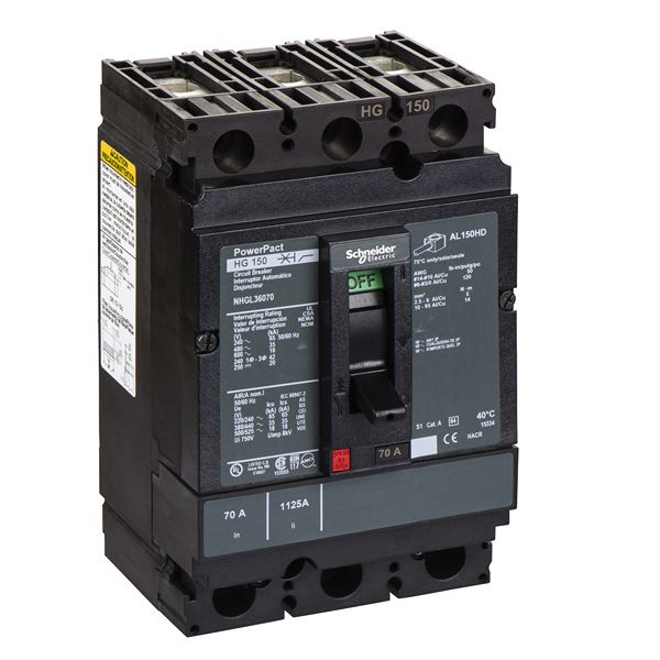 This is PowerPact MCCB 3P 70A Breaking Capacity 18 kA DIN Rail Mount manufactured by Schneider Electric. The manufacturer part number is NHGL36070. The product has a current rating of 70a. The product powerpact, is a highly preferred choice for users. The product is available in din rail mount style. It features powerpact range. The product has 18 ka breaking capacity at maximum voltage rating. It has equipped with 3 poles.