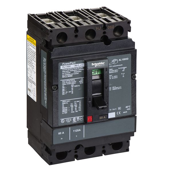 This is PowerPact MCCB 3P 60A Breaking Capacity 18 kA DIN Rail Mount manufactured by Schneider Electric. The manufacturer part number is NHJL36060. The product has a current rating of 60a. The product powerpact, is a highly preferred choice for users. The product is available in din rail mount style. It features powerpact range. The product has 18 ka breaking capacity at maximum voltage rating. It has equipped with 3 poles.
