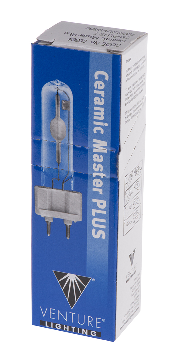 This is 70 W CM-PLUS T Clear Metal Halide Lamp G12 Tubular Enclosed Fitting 7000 lm 12000h manufactured by Venture Lighting. The manufacturer part number is CM-PLUS T 70W/U/UVS/830. Whereas, its mounting orientation is universal . Its diameter is 19mm. It includes a/an tubular shape lamp . Features luminosity up to 7000 lm. This product carries 70 w. This enclosed tool is easy to use with versatile applications in various settings. It has clear lamp finish . The lamp base is g12. Its accurate length is 90 mm. This integrates a colour temperature of 3000k. It has about 80 colour rendering . It is a type of cm-plus t lamp. Adding to this, it has a long life span for about 12000h.