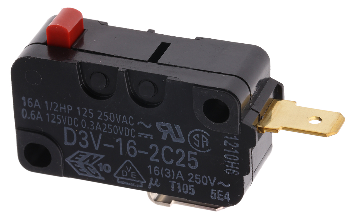 This is SPST-NC Pin Plunger Microswitch 16 A @ 250 V ac manufactured by Omron. The manufacturer part number is D3V-16-2C25. Whereas, the minimum operating temperature of the product is -25°c. It is IP rated with ip40. The rated contact current is 16 a @ 250 v ac. The product has -25 → +105°c of operating temperature range. The contact is equipped with spst configuration. The product carries pin plunger actuator. The product also provide mechanical stability with 10000000operations. It has a maximum operating temperature of +105°c. The terminal is a tab type. The product is made from sturdy silver alloy materials.