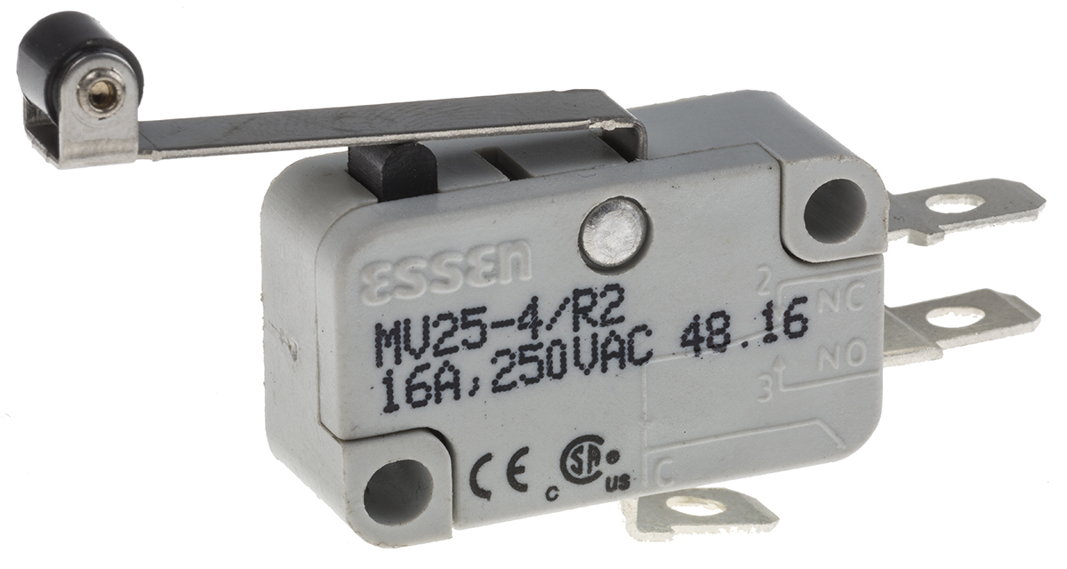 This is SPDT Long Roller Lever Microswitch 16 A @ 250 V ac manufactured by RS Pro. The manufacturer part number is 804-6206. It has a 250 gms of operating force. The product complies with all safety standards, such as ce, csa, iec 1058-1, lcso. Moreover, the product has a nominal 250v ac voltage rating. The rated contact current is 16 a @ 250 v ac. Whereas, the minimum operating temperature of the product is -55°c. The product has -55 → +85°c of operating temperature range. The contact is equipped with sp-dt configuration. The casing is constructed from highly stable glass filled thermoplastic material. The product carries long roller lever actuator. The product is made from sturdy silver on copper materials. The product also provide mechanical stability with 10000000operations. It carries a release force of 25gf. It has a maximum operating temperature of +85°c. The terminal is a solder type. It has a v3 housing switch housing .