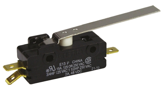 This is SPDT-NO/NC Hinge Lever Microswitch 15 A @ 250 V ac manufactured by ZF. The manufacturer part number is E13-50H. It has a 0.64 n of operating force. The rated contact current is 15 a @ 250 v ac. The contact is equipped with spdt configuration. The product carries hinge lever actuator. The terminal is a tab type. The product is made from sturdy silver cadmium oxide materials.