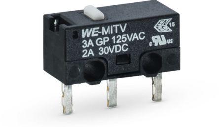 This is THT Micro Switch Terminal with Actuator manufactured by Wurth Elektronik. The manufacturer part number is 463091370402. It has a 150 gf of operating force. The product complies with all safety standards, such as enec approved enec-02331, ul approved e483308. Moreover, the product has a nominal 30 v dc, 125 v ac voltage rating. The rated contact current is 3 a. The product has -40 → +85°c of operating temperature range. The contact is equipped with single pole double throw (spdt) configuration. The casing is constructed from highly stable pbt material. Whereas, the minimum operating temperature of the product is -40°c. It has a maximum operating temperature of +85°c. The terminal is a through hole type. The product is made from sturdy copper alloy materials.
