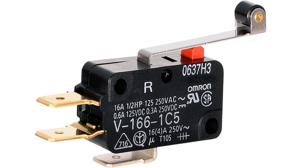 This is SPDT Hinge Roller Lever Microswitch 16 A Quick Connect Terminal manufactured by Omron. The manufacturer part number is V-166-1C5. It is IP rated with ip40. The rated contact current is 16 a. The contact is equipped with spdt configuration. The product carries hinge roller lever actuator. The terminal is a quick connect type.