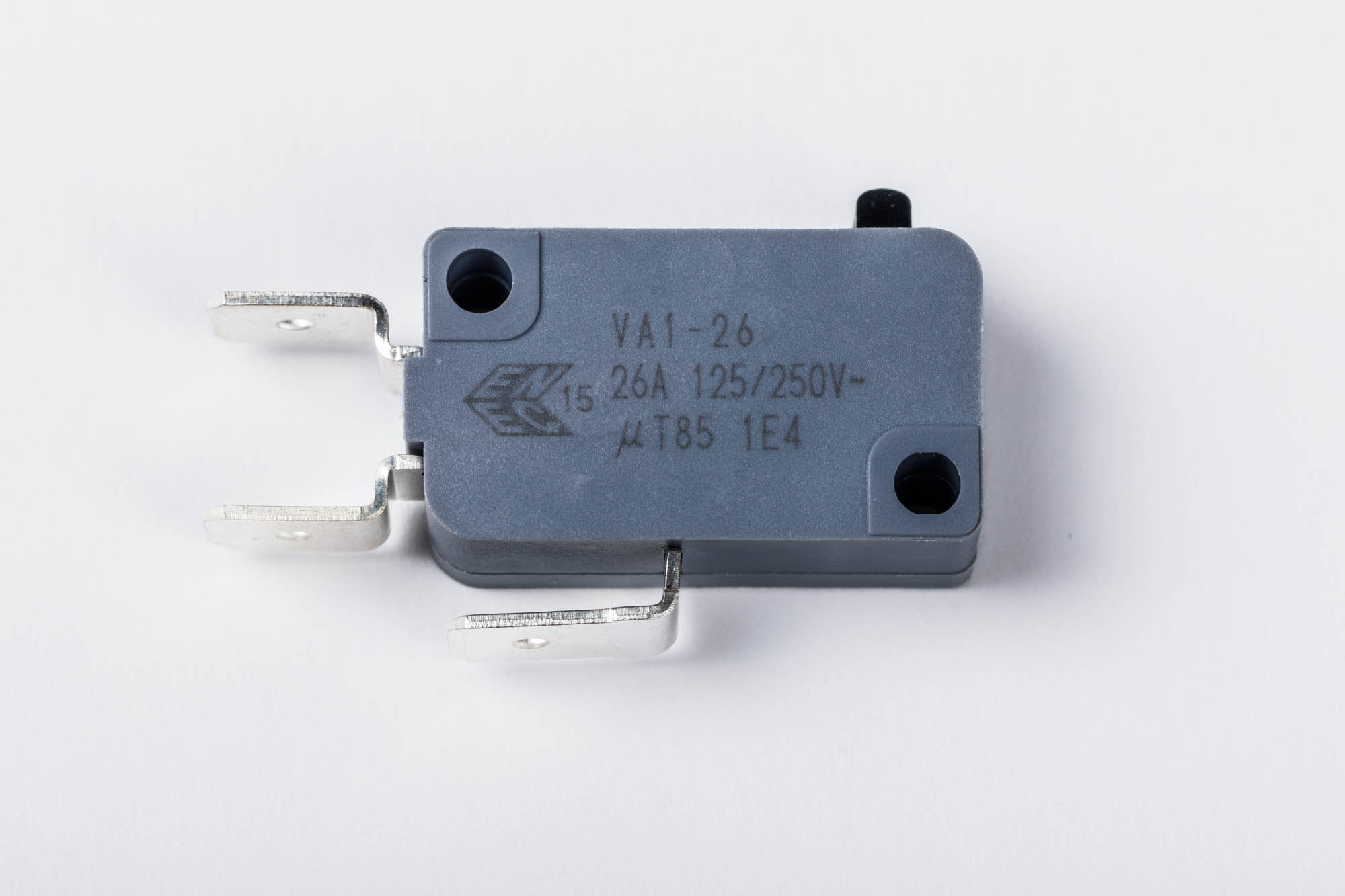 This is Snap Action Micro Switch Solder Terminal 26A SPDT manufactured by Zippy. The manufacturer part number is VA1-26Q0-00E0-Z. The rated contact current is 26a. The terminal is a solder type. The contact is equipped with spdt configuration.