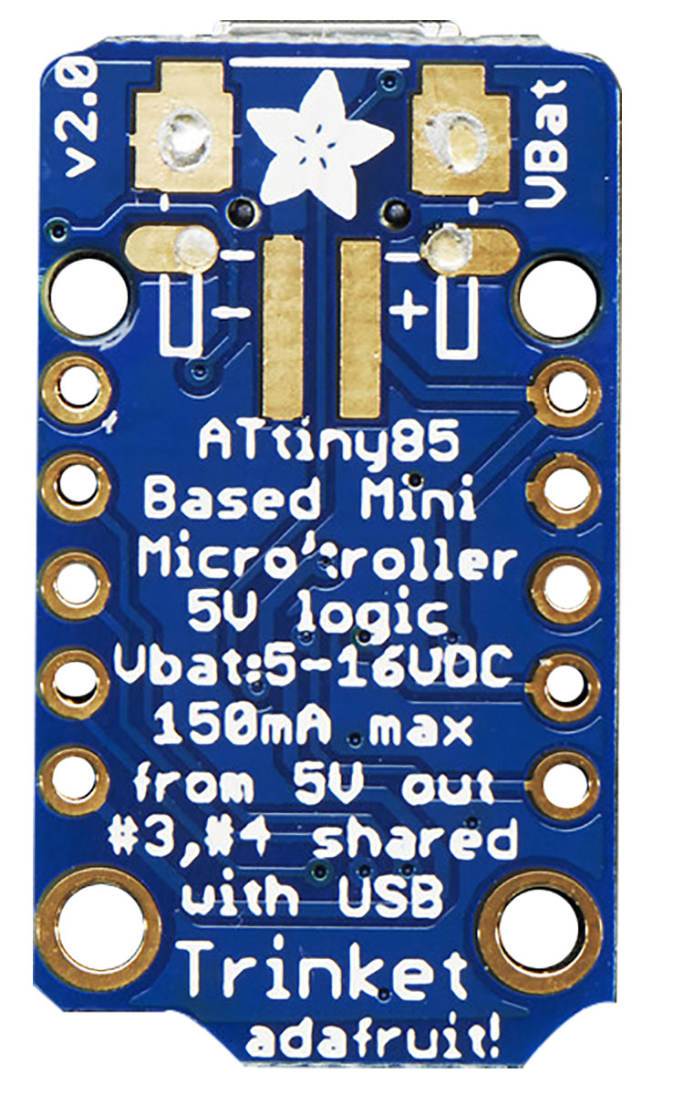This is Adafruit Trinket - Mini Micro 5V manufactured by ADAFRUIT INDUSTRIES. The manufacturer part number is 1501. Additionally, its processor has a/an sam family name . This kit is known as trinket 5v, consists of highly versatile and user-desired tools. It is classified as a/an development board . The processor part number is attiny85 . It contains a/an mcu type processor . This product use mcu technology.