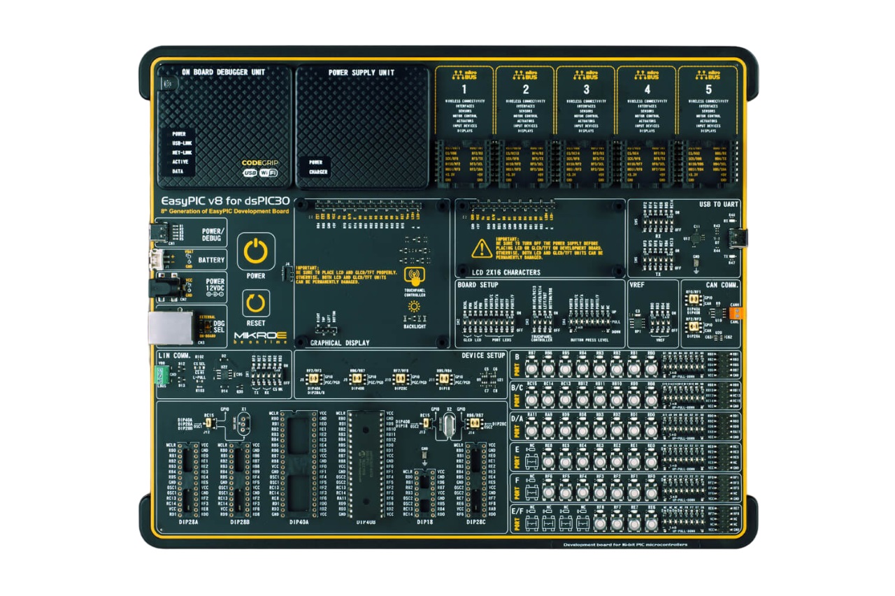 This is EasyPIC v8 for dsPIC30 Development Board manufactured by Brand-Rex. The manufacturer part number is MIKROE-4511. On the other hand, the dspic is the device core. Additionally, its processor has a/an 8th generation family name . This kit is known as easypic v8 for dspic30, consists of highly versatile and user-desired tools. It is classified as a/an development board .