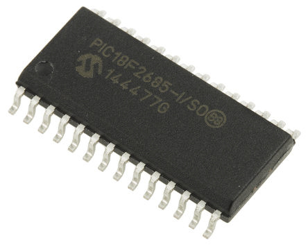 This is 8bit PIC Microcontroller 40MHz 96 kB 1024 B Flash 28-Pin SOIC manufactured by Microchip. The manufacturer part number is PIC18F2685-I/SO. The given dimensions of the product include 17.9 x 7.5 x 2.35mm. Moreover, it comprises 1 I2C channels. It contains 1 USART channels. The product integrates 0 USB channels. Furthermore, the product is 7.5mm wide. In addition, 96 kb, 1024 b is the program memory size. Furthermore, it is composed of 1 PWM units. The product has typical 3.328 kb RAM size. Moreover, the data bus width includes 8bit. The instruction set has risc architecture. It is a flash program memory type. The package is a sort of soic. It features 40mhz of maximum frequency. It contains 0 PCI channel . It includes 0 dedicated LIN channels . It has a maximum operating temperature of +85 °c. It is also composed of 0 UART channels. Whereas, the minimum operating temperature of the product is -40 °c. Moreover, the product includes 0 maximum ethernet channels . The product belongs to a family pic18f. On the other hand, the pic is the device core. Its accurate length is 17.9mm. It contains 1 ADC units. It contains 28 pins. The product carries 1 (ccp) of pulse width modulation. The product is available in surface mount configuration. It contains 0 dedicated ethernet channels . In addition, the height is 2.35mm. It has 4.2 → 5.5 v of typical operating supply voltage. The ADCs included 8 x 10 bit. Moreover, it consists of 1 CAN channels. Furthermore, it is composed of 1 SPI channels.