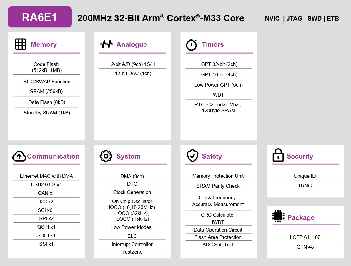This is MCU RA6 ARM CM33 200MHZ 1M/256K QFP100 manufactured by Renesas Electronics. The manufacturer part number is R7FA6E10F2CFP#AA0. Furthermore, the product is 14.1 mm wide. In addition, the height is 1.4mm. In addition, 1024kb is the program memory size. The product has typical 256kb RAM size. The product complies with automotive standard - no. It comprises 12 timers. Moreover, the data bus width includes 32bit. The instruction set has cisc architecture. It is a flash program memory type. It has a minimum 2.7v supply voltage . The package is a sort of lqfp. In addition, it has a maximum clock frequency about 200mhz . microcontroller is a versatile product designed to provide user-defined applications. It has a maximum operating temperature of 85°c. On the other hand, the arm cortex m33 is the device core. Its accurate length is 14.1mm. It contains 100 pins. It has a surface type mount . The product ra6e1, is a highly preferred choice for users. The product requires a maximum 3.6v supply voltage . The ADCs included 11 x 12 bit. Whereas, the minimum operating temperature of the product is -40°c.