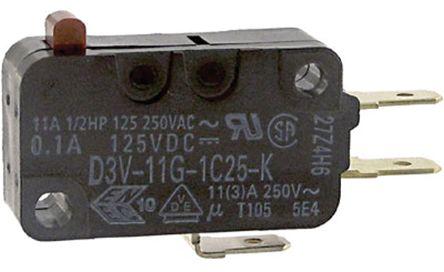 This is SPDT Pin Plunger Microswitch 11 A @ 250 V ac manufactured by Omron. The manufacturer part number is D3V-11G-1C25-K. It has a 200 gf of operating force. Whereas, the minimum operating temperature of the product is -25°c. It is IP rated with ip40. The rated contact current is 11 a @ 250 v ac. The product has -25 → +105°c of operating temperature range. The contact is equipped with spdt configuration. The product carries pin plunger actuator. The product also provide mechanical stability with 10000000operations. The product is made from sturdy silver alloy materials. It has a maximum operating temperature of +105°c. The terminal is a quick connect type. It has a d3v housing switch housing .
