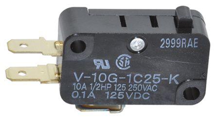 This is SPDT Pin Plunger Microswitch 10 A @ 250 V ac manufactured by Omron. The manufacturer part number is V-10G-1C25-K. It has a 200 gf of operating force. Whereas, the minimum operating temperature of the product is -25°c. It is IP rated with ip40. The rated contact current is 10 a @ 250 v ac. The product has -25 → +80°c of operating temperature range. The contact is equipped with spdt configuration. The casing is constructed from highly stable thermosetting material. The product carries pin plunger actuator. The product also provide mechanical stability with 300000operations. It carries a release force of 50gf. It has a maximum operating temperature of +80°c. The terminal is a quick connect type. The product is made from sturdy silver materials.