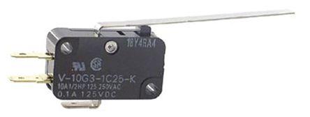 This is SPDT Long Hinge Lever Microswitch 10 A @ 250 V ac manufactured by Omron. The manufacturer part number is V-10G3-1C25-K. It has a 200 gf of operating force. Whereas, the minimum operating temperature of the product is -25°c. It is IP rated with ip40. The rated contact current is 10 a @ 250 v ac. The product has -25 → +80°c of operating temperature range. The contact is equipped with spdt configuration. The product carries long hinge lever actuator. The product also provide mechanical stability with 50000000operations. The product is made from sturdy silver materials. It has a maximum operating temperature of +80°c. The terminal is a quick connect type. It has a v1 housing switch housing .