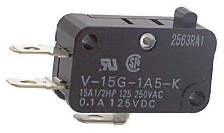This is SPDT Short Hinge Lever Microswitch 15 A @ 250 V ac manufactured by Omron. The manufacturer part number is V15G1A5KBYOMI. It has a 200 gf of operating force. Whereas, the minimum operating temperature of the product is -25°c. It is IP rated with ip40. The rated contact current is 15 a @ 250 v ac. The product has -25 → +80°c of operating temperature range. The contact is equipped with spdt configuration. The product carries short hinge lever actuator. The product also provide mechanical stability with 50000000operations. The product is made from sturdy silver alloy materials. It has a maximum operating temperature of +80°c. The terminal is a solder type. It has a v1 housing switch housing .