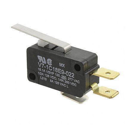 This is SPDT Straight Lever Microswitch 15 A manufactured by Honeywell. The manufacturer part number is V7-1C18E9-022. It has a 0.83 n of operating force. Whereas, the minimum operating temperature of the product is -40°c. The product has -40 → +85°c of operating temperature range. The rated contact current is 15 a. The contact is equipped with spdt configuration. The casing is constructed from highly stable thermoplastic material. The product carries straight lever actuator. The product is made from sturdy silver/gold plated/gold alloy materials. The product also provide mechanical stability with 10000000cycles. It carries a release force of 0.05n. It has a maximum operating temperature of +85°c. The terminal is a quick connect type. It has a v7 housing switch housing .