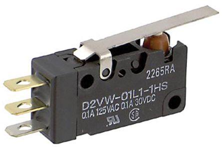 This is SPDT Hinge Lever Microswitch 100 mA @ 30 V dc manufactured by Omron. The manufacturer part number is D2VW-01L1-1HS. Whereas, the minimum operating temperature of the product is -40°c. It is IP rated with ip67. The rated contact current is 100 ma @ 30 v dc. The product has -40 → +85°c of operating temperature range. The contact is equipped with spdt configuration. The product carries hinge lever actuator. The product also provide mechanical stability with 10000000operations. The product is made from sturdy gold alloy materials. It has a maximum operating temperature of +85°c. The terminal is a solder, tab type. It has a d2 housing switch housing .