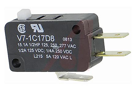 This is SPDT Pin Plunger Microswitch 15 A manufactured by Honeywell. The manufacturer part number is V7-1C17D8. It has a 1.47 n of operating force. Whereas, the minimum operating temperature of the product is -40°c. The product has -40 → +85°c of operating temperature range. The rated contact current is 15 a. The contact is equipped with sp-co configuration. The casing is constructed from highly stable thermoplastic material. The product carries pin plunger actuator. The product is made from sturdy silver/gold plated/gold alloy materials. The product also provide mechanical stability with 10000000cycles. It carries a release force of 0.24n. It has a maximum operating temperature of +85°c. The terminal is a quick connect type. It has a v7 housing switch housing .