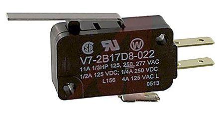 This is SPDT Straight Lever Microswitch 11 A @ 250 V ac manufactured by Honeywell. The manufacturer part number is V7-2B17D8-022. It has a 0.4 n of operating force. Whereas, the minimum operating temperature of the product is -40°c. The product has -40 → +85°c of operating temperature range. The rated contact current is 11 a @ 250 v ac. The contact is equipped with spdt configuration. The casing is constructed from highly stable thermoplastic material. The product carries straight lever actuator. The product is made from sturdy silver/gold plated/gold alloy materials. The product also provide mechanical stability with 10000000cycles. It carries a release force of 0.03n. It has a maximum operating temperature of +85°c. The terminal is a quick connect type. It has a v7 housing switch housing .