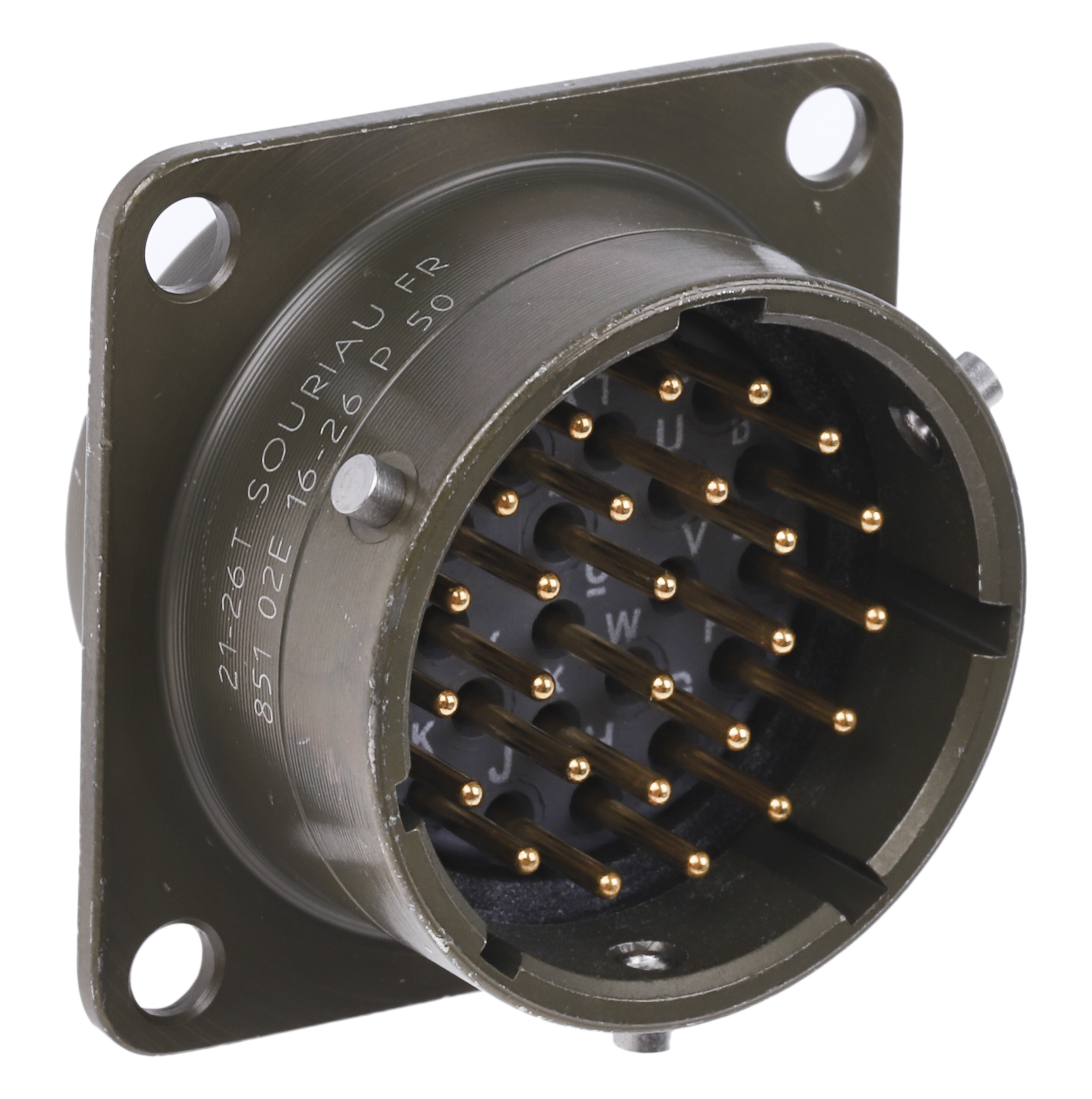 This is Souriau 851 26 Way Panel Mount MIL Spec Circular Connector Receptacle Pin ContactsShell Size 16 Bayonet Coupling manufactured by Souriau Sunbank by Eaton. The manufacturer part number is 85102E1626P50. The product 851, is a highly preferred choice for users. The product has a current rating of 7.5a. It is a type of bayonet coupling mating. The product is available in panel mount configuration. In addition, female is the available "Gender" of the product. It has straight body orientation. It allows solder termination method. This male contact is widely suited for specific applications. It complies with mil-dtl-26482 military standard. The high-quality gold is used as contact plating material. The shell has 16 size. The product contains 26 contacts. It has a maximum operating temperature of +125°c. Whereas, the minimum operating temperature of the product is -55°c. The shell is plated with high stable olive drab cadmium material. The product is made from sturdy copper alloy materials.
