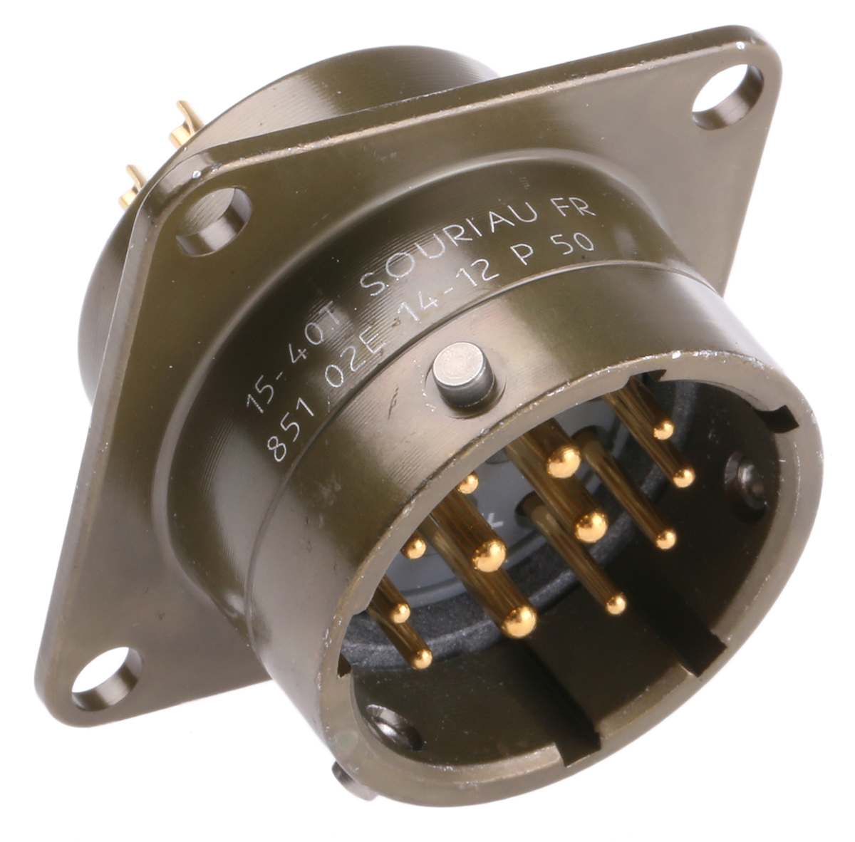 This is Souriau 851 12 Way Panel Mount MIL Spec Circular Connector Receptacle Pin ContactsShell Size 14 Bayonet Coupling manufactured by Souriau Sunbank by Eaton. The manufacturer part number is 85102E1412P50. The product 851, is a highly preferred choice for users. The product has a current rating of 13a. It is a type of bayonet coupling mating. The product is available in panel mount configuration. In addition, female is the available "Gender" of the product. It has straight body orientation. It allows solder termination method. This male contact is widely suited for specific applications. It complies with mil-dtl-26482 military standard. The high-quality gold is used as contact plating material. The shell has 14 size. The product contains 12 contacts. It has a maximum operating temperature of +125°c. Whereas, the minimum operating temperature of the product is -55°c. The shell is plated with high stable olive drab cadmium material. The product is made from sturdy copper alloy materials.