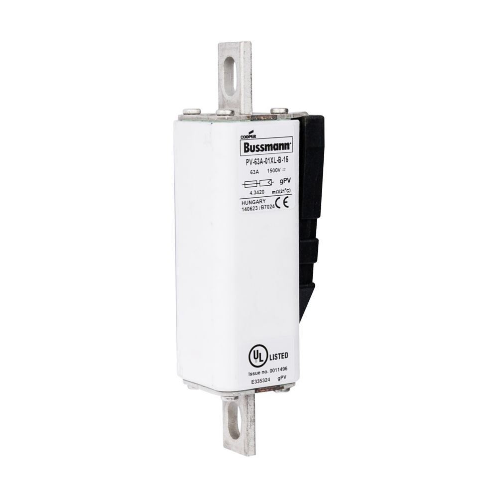 This is manufactured by Eaton. The manufacturer part number is PV-63A-01XL-B-15. Is it a better world product? yes. Moreover, the product has a nominal 1.5kv voltage rating. It has a typical 163mm fixing centres . A fuse with a 01xl size. The fuse complies with iec 60269-6 standards. The product has a current rating of 63a. It has typical 6 weeks of manufacturer standard lead time. Its typical moisture sensitivity level is 1 (unlimited). It is available in the standard package of 1. The eaton's product offers user-desired applications.