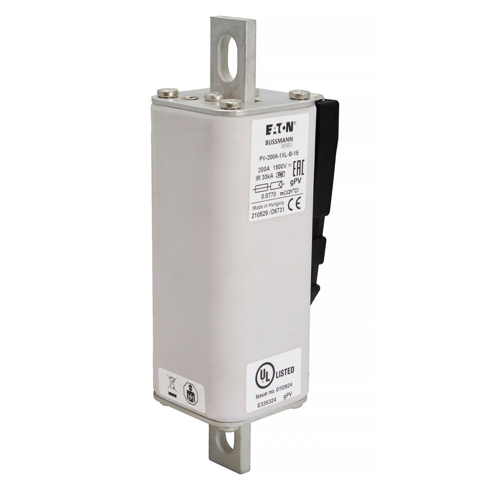 This is manufactured by Eaton. The manufacturer part number is PV-200A-1XL-B-15. Is it a better world product? yes. The product has a current rating of 200a. Moreover, the product has a nominal 1.5kv voltage rating. It has a typical 159mm fixing centres . A fuse with a 1xl size. The fuse complies with iec 60269-6 standards. It has typical 8 weeks of manufacturer standard lead time. Its typical moisture sensitivity level is 1 (unlimited). It is available in the standard package of 1. The eaton's product offers user-desired applications.