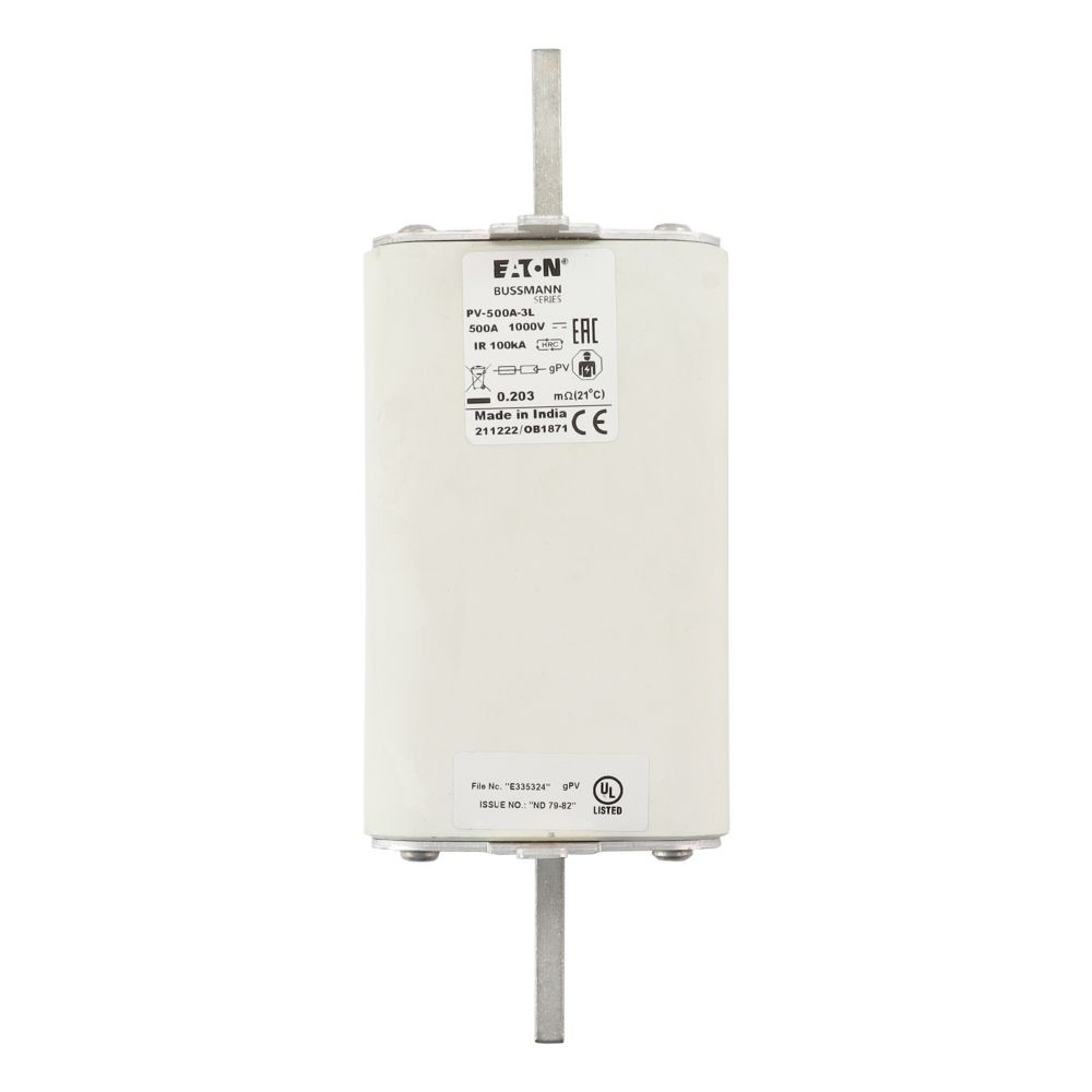 This is manufactured by Eaton. The manufacturer part number is PV-500A-3L. The product has a current rating of 500a. Moreover, the product has a nominal 1kv voltage rating. It has a typical 205mm fixing centres . A fuse with a 3l size. The fuse complies with iec 60269-6 standards. It has typical 8 weeks of manufacturer standard lead time. Its typical moisture sensitivity level is 1 (unlimited). It is available in the standard package of 1. The eaton's product offers user-desired applications.