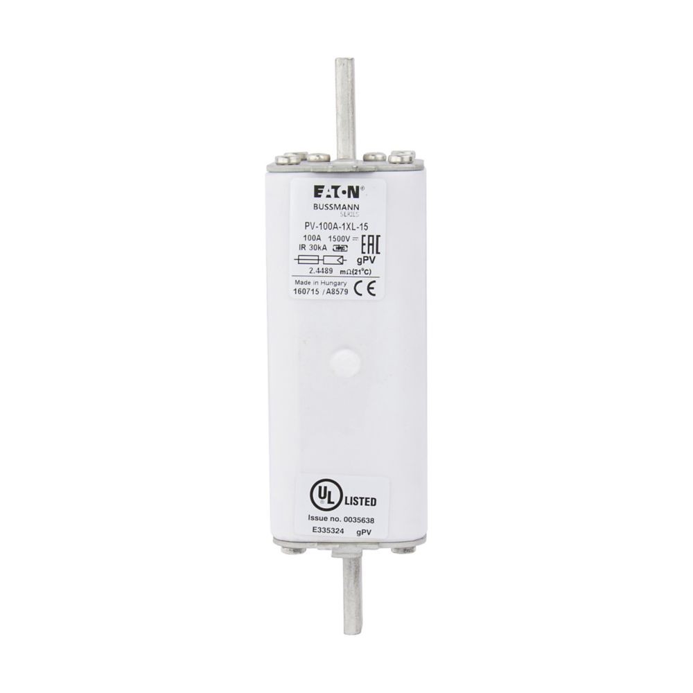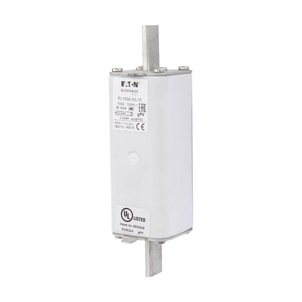 This is manufactured by Eaton. The manufacturer part number is PV-100A-1XL-15. The product has a current rating of 100a. Moreover, the product has a nominal 1.5kv voltage rating. It has a typical 189mm fixing centres . A fuse with a 1xl size. The fuse complies with iec 60269-6 standards. It has typical 8 weeks of manufacturer standard lead time. Its typical moisture sensitivity level is 1 (unlimited). It is available in the standard package of 1. The eaton's product offers user-desired applications.