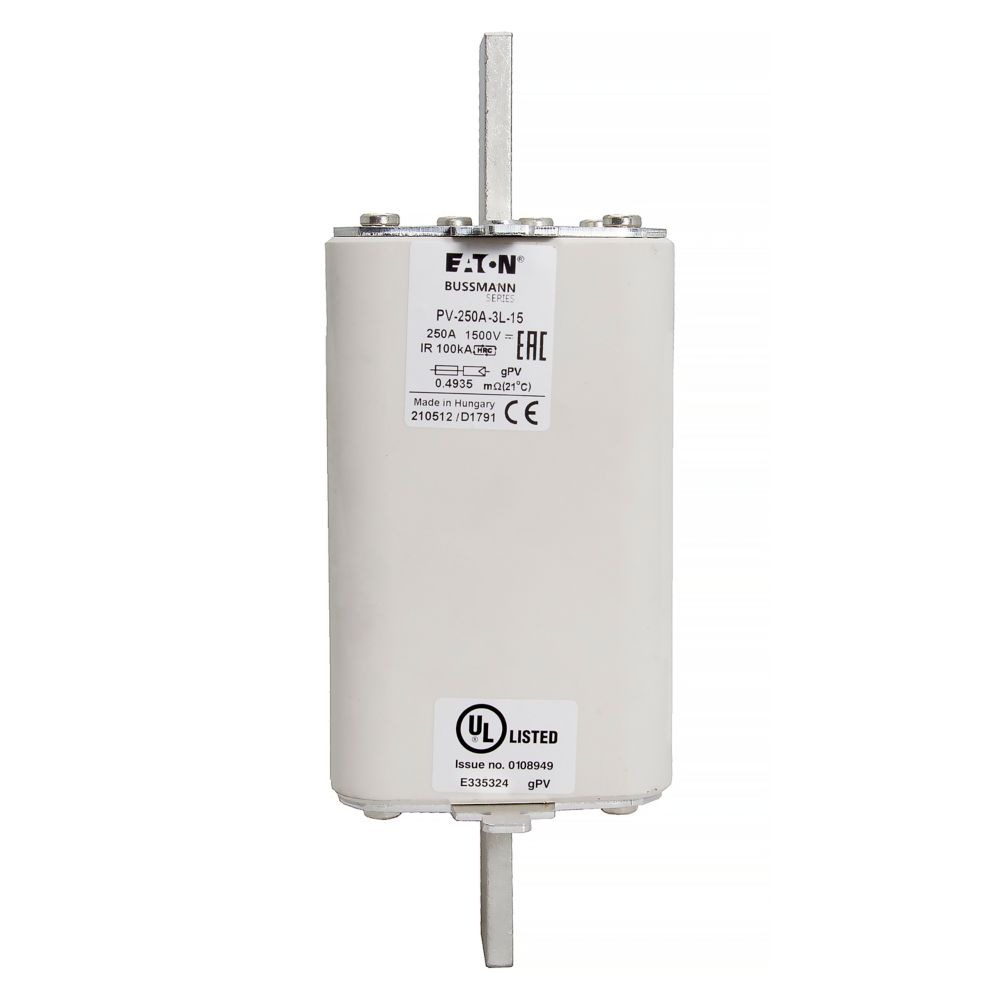 This is manufactured by Eaton. The manufacturer part number is PV-250A-3L-15. It has a typical 205mm fixing centres . Moreover, the product has a nominal 1.5kv voltage rating. A fuse with a 3l size. The product has a current rating of 250a. The fuse complies with iec 60269-6 standards. It has typical 8 weeks of manufacturer standard lead time. Its typical moisture sensitivity level is 1 (unlimited). It is available in the standard package of 1. The eaton's product offers user-desired applications.