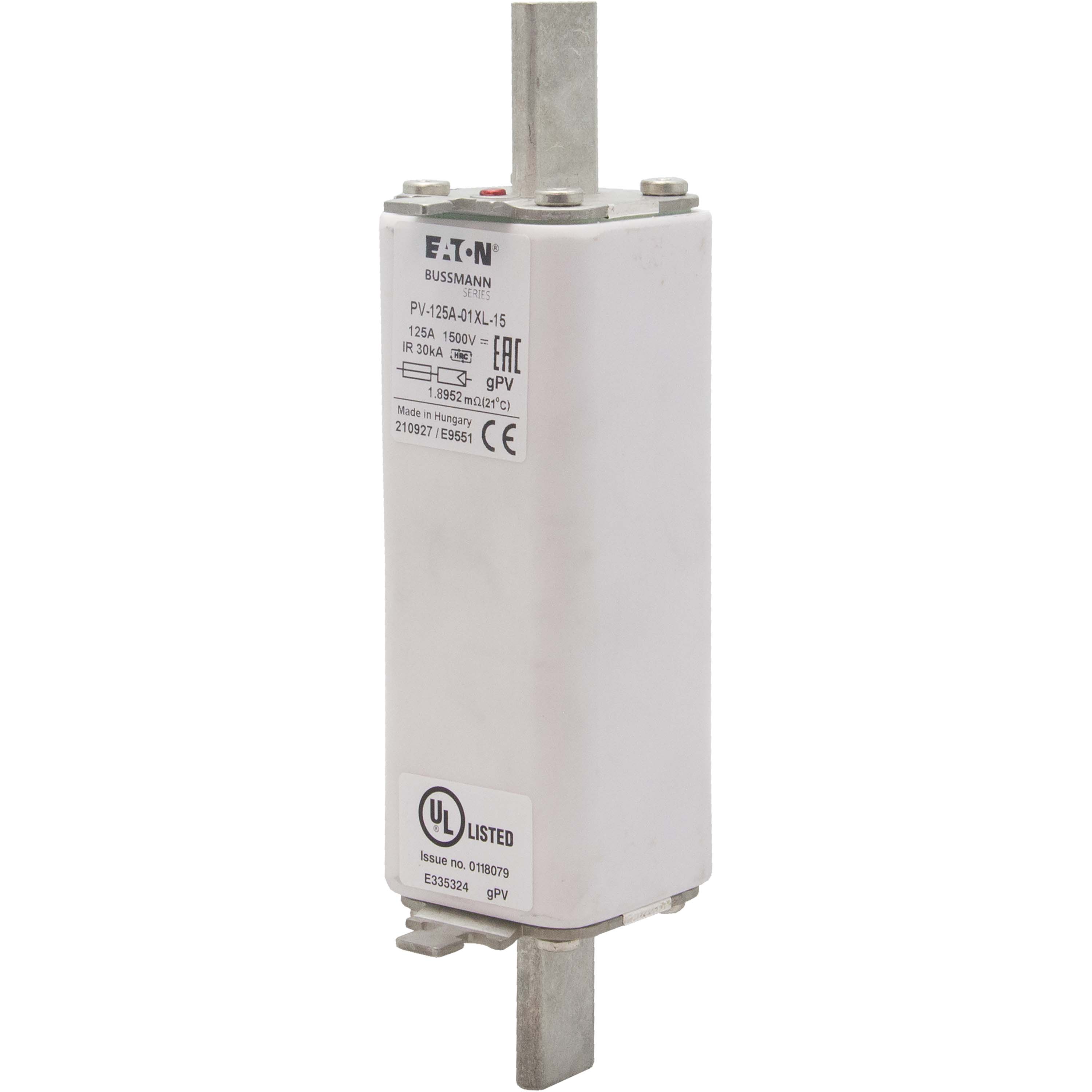 This is manufactured by Eaton. The manufacturer part number is PV-125A-01XL. It has a typical 189mm fixing centres . Moreover, the product has a nominal 1kv voltage rating. A fuse with a 01xl size. The product has a current rating of 125a. The fuse complies with iec 60269-6 standards. It has typical 6 weeks of manufacturer standard lead time. Its typical moisture sensitivity level is 1 (unlimited). It is available in the standard package of 1. The eaton's product offers user-desired applications.