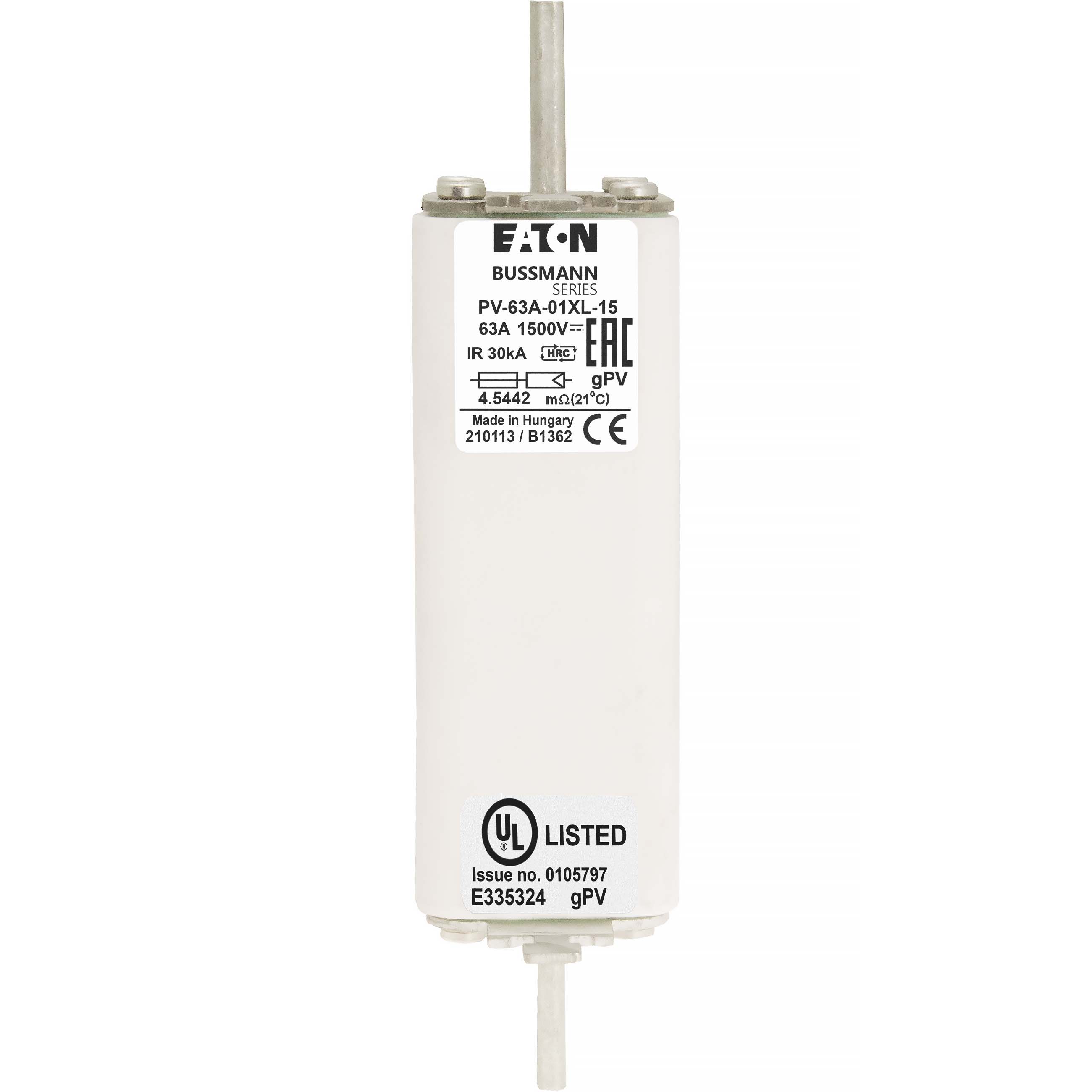 This is manufactured by Eaton. The manufacturer part number is PV-63A-01XL-15. The product has a current rating of 63a. Moreover, the product has a nominal 1.5kv voltage rating. It has a typical 189mm fixing centres . A fuse with a 01xl size. The fuse complies with iec 60269-6 standards. It has typical 6 weeks of manufacturer standard lead time. Its typical moisture sensitivity level is 1 (unlimited). It is available in the standard package of 1. The eaton's product offers user-desired applications.
