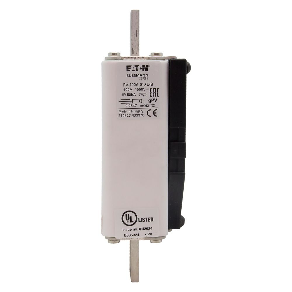 This is manufactured by Eaton. The manufacturer part number is PV-100A-1XL-B-15. Is it a better world product? yes. The product has a current rating of 100a. Moreover, the product has a nominal 1.5kv voltage rating. It has a typical 159mm fixing centres . A fuse with a 1xl size. The fuse complies with iec 60269-6 standards. It has typical 8 weeks of manufacturer standard lead time. Its typical moisture sensitivity level is 1 (unlimited). It is available in the standard package of 1. The eaton's product offers user-desired applications.