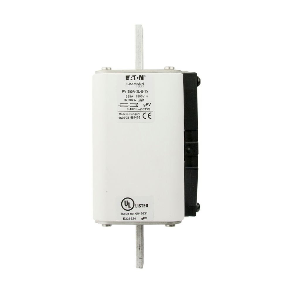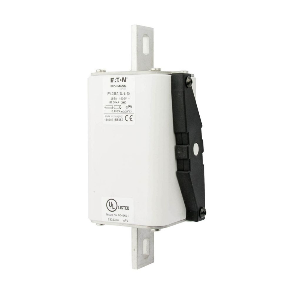 This is manufactured by Eaton. The manufacturer part number is PV-355A-3L-B-15. Is it a better world product? yes. The product has a current rating of 355a. Moreover, the product has a nominal 1.5kv voltage rating. It has a typical 170mm fixing centres . A fuse with a 3l size. The fuse complies with iec 60269-6 standards. It has typical 8 weeks of manufacturer standard lead time. Its typical moisture sensitivity level is 1 (unlimited). It is available in the standard package of 1. The eaton's product offers user-desired applications.