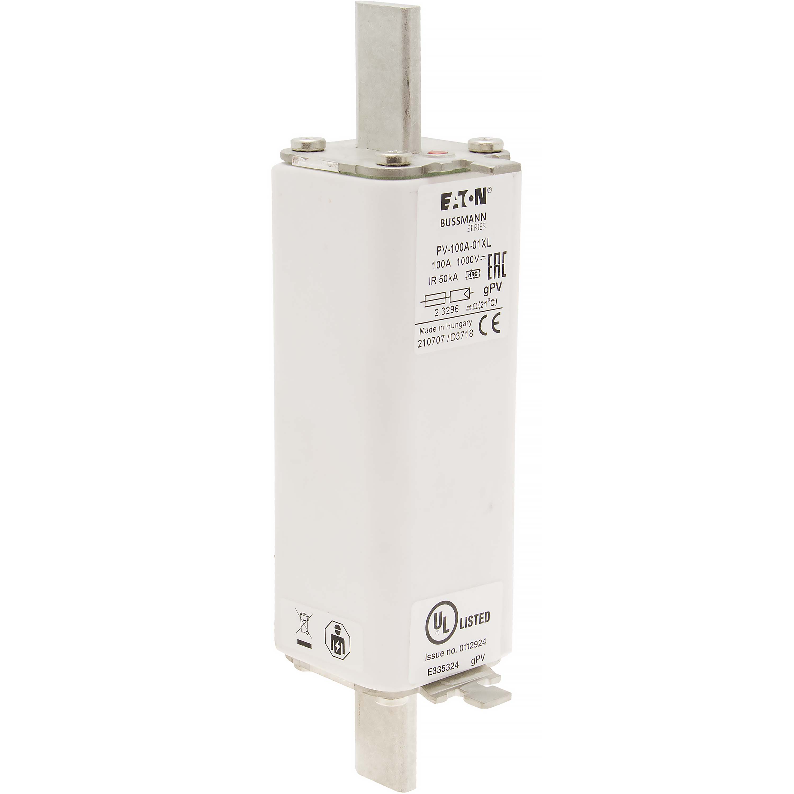 This is manufactured by Eaton. The manufacturer part number is PV-100A-01XL. It has a typical 189mm fixing centres . Moreover, the product has a nominal 1kv voltage rating. A fuse with a 01xl size. The product has a current rating of 100a. The fuse complies with iec 60269-6 standards. It has typical 8 weeks of manufacturer standard lead time. Its typical moisture sensitivity level is 1 (unlimited). It is available in the standard package of 1. The eaton's product offers user-desired applications.