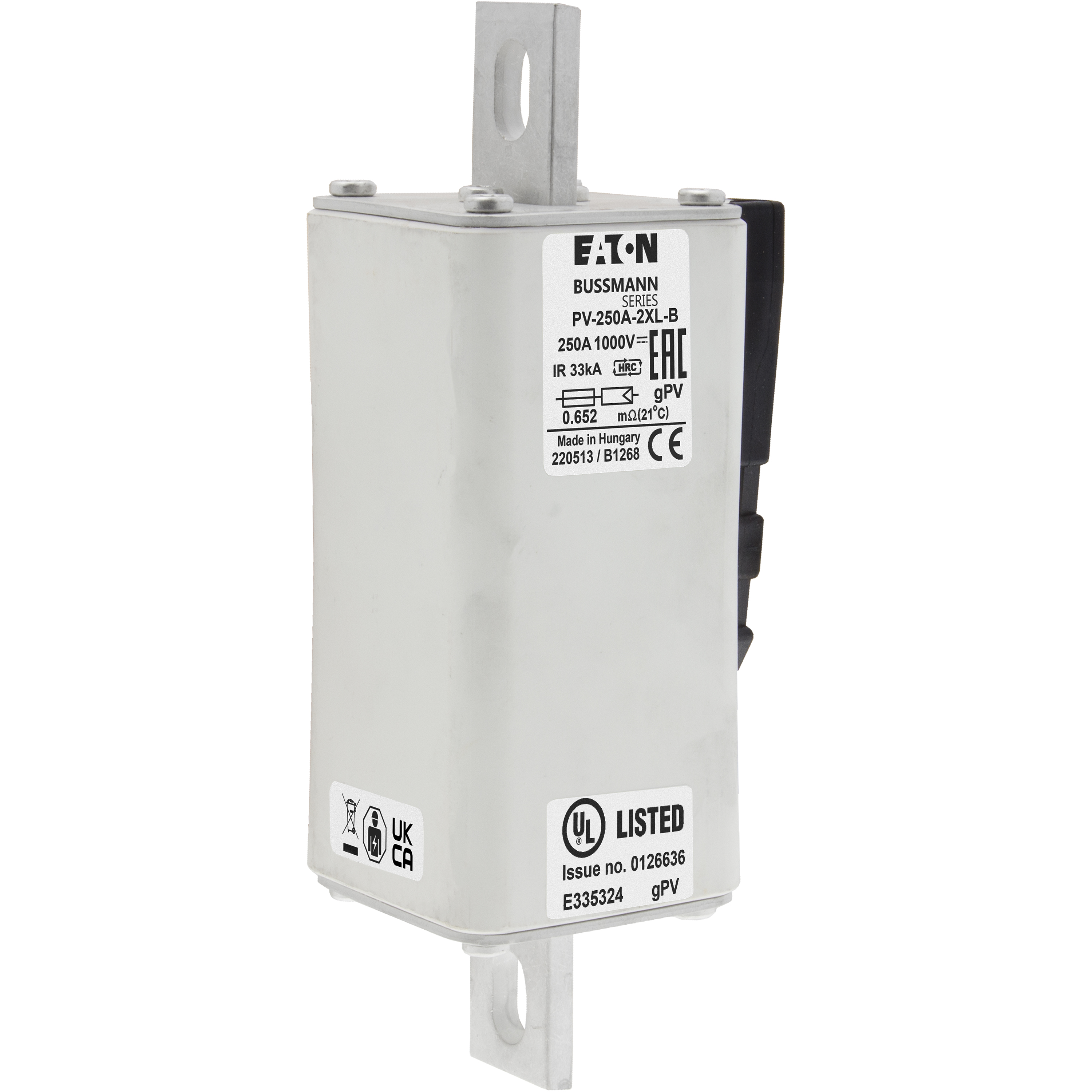 This is manufactured by Eaton. The manufacturer part number is PV-250A-2XL-B. Is it a better world product? yes. The product has a current rating of 250a. Moreover, the product has a nominal 1kv voltage rating. It has a typical 167mm fixing centres . A fuse with a 217 x 82 x 94mm size. The fuse complies with iec 60269-6 standards. It has typical 4 weeks of manufacturer standard lead time. Its typical moisture sensitivity level is 1 (unlimited). It is available in the standard package of 1. The eaton's product offers user-desired applications.