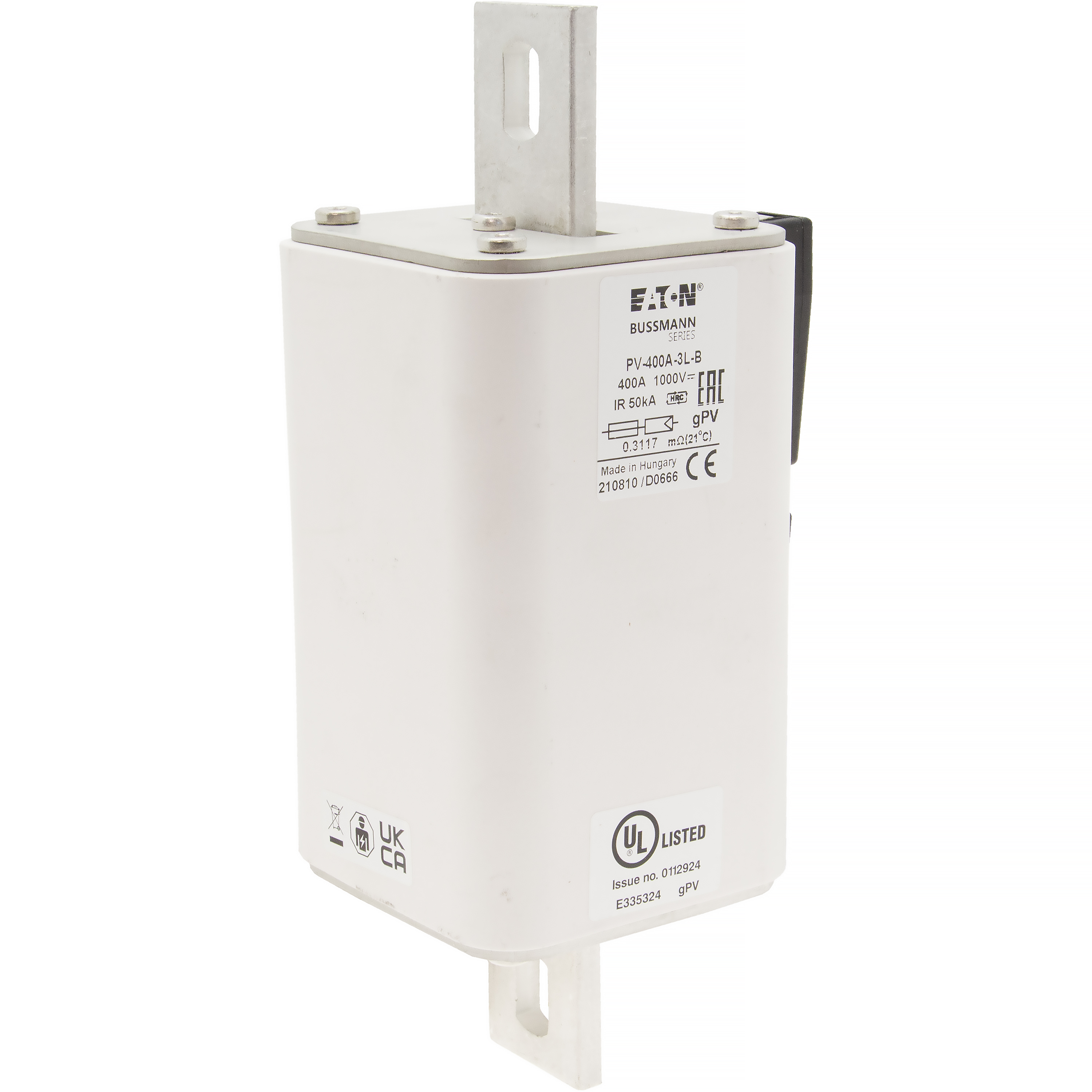 This is manufactured by Eaton. The manufacturer part number is PV-400A-3L-B. Is it a better world product? yes. The product has a current rating of 400a. Moreover, the product has a nominal 1kv voltage rating. It has a typical 170mm fixing centres . A fuse with a 91 x 201.4 x 73.5mm size. The fuse complies with iec 60269-6 standards. It has typical 4 weeks of manufacturer standard lead time. Its typical moisture sensitivity level is 1 (unlimited). It is available in the standard package of 1. The eaton's product offers user-desired applications.