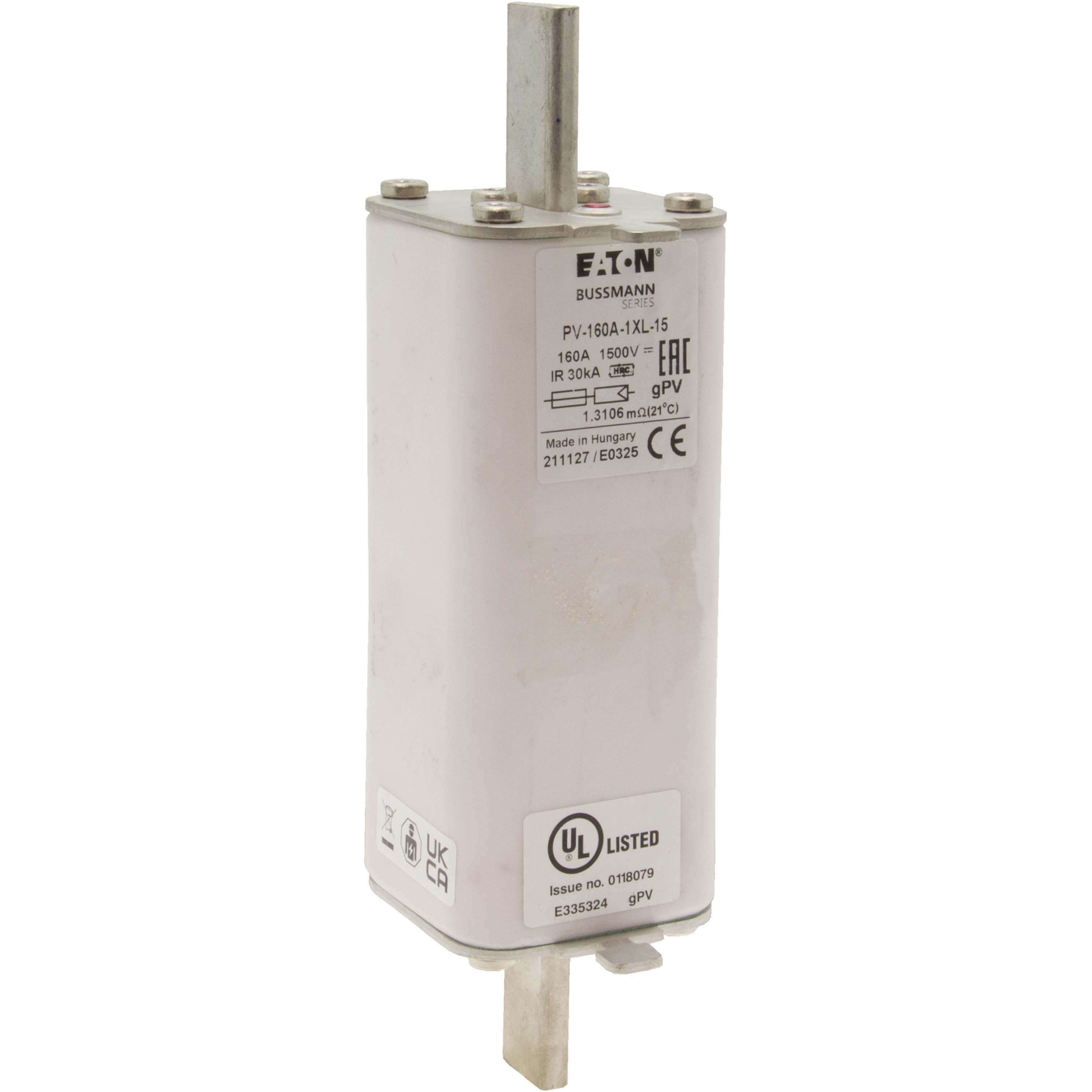 This is manufactured by Eaton. The manufacturer part number is PV-160A-1XL-15. It has a typical 189mm fixing centres . Moreover, the product has a nominal 1.5kv voltage rating. A fuse with a 1xl size. The product has a current rating of 160a. The fuse complies with iec 60269-6 standards. It has typical 8 weeks of manufacturer standard lead time. Its typical moisture sensitivity level is 1 (unlimited). It is available in the standard package of 1. The eaton's product offers user-desired applications.