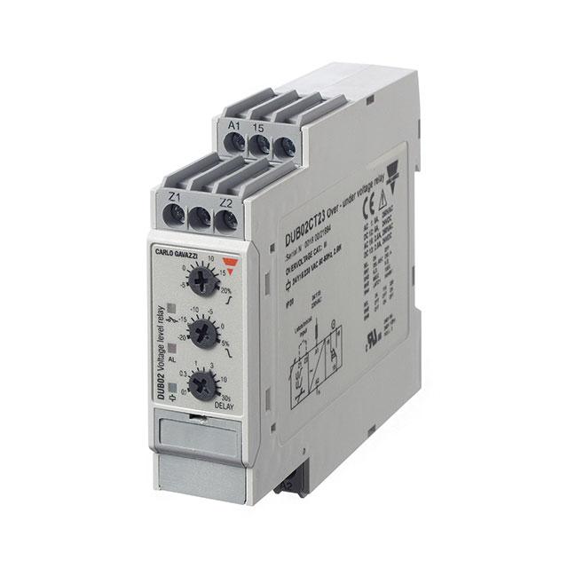 This is manufactured by Carlo Gavazzi Inc.. The manufacturer part number is DUB02CT23. It is assigned with possible HTSUS value of 9107.00.8000. The product is rohs3 compliant. It comes in voltage sensing ac configuration. In addition, it is reach unaffected. Furthermore, it has arelay output. It has 19.2 ~ 275v ac trip range. The product has energized high/low trip status. The carlo gavazzi inc.'s product offers user-desired applications. Its typical moisture sensitivity level is not applicable. It has an integral spdt (1 form c) circuit. The given contact rating of the product and its voltage includes 8a @ 250vac. It has a long 7 weeks standard lead time. A product has a fixed, 1 sec, 6 sec delay time. The product is available in din rail configuration. The product dub02, is a highly preferred choice for users. In addition, box is the available packaging type of the product. It has optimum voltage supply of 24 ~ 230vac. Moreover, it corresponds to dub02c, a base product number of the product. The product is designated with the ear99 code number.